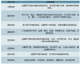 染料主要用途是用于紗線及面料的染色印花、皮革染色、紙張染色、食品添加以及塑料填色領域。按照性質及應用方法,可將染料分為分散染料、活性染料、硫化染料、還原染料、酸性染料、直接染料等若干類別。