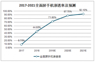隨著屏幕尺寸的增加,為了節省多余空間讓屏幕畫面更大,全面屏手機成為主流全面屏手機指的是真實屏占比可以達到80%以上,擁有超窄邊框設計的手機。全面屏手機不僅提升了手機的一體感,另外機身正面的面積可以容納更大的屏幕,對視覺體驗有著顯著的提升。另外,由于傳統智能手機采用的顯示屏分辨率比例均為16:9,而目前全面屏手機的屏幕比例接近18:9,能有效提高手機的顯示面積。預測全面屏手機滲透率將在2019年超過70%,2021年將達到92.1%