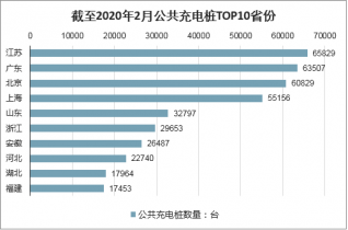 根據(jù)中國(guó)電動(dòng)汽車(chē)充電基礎(chǔ)設(shè)施促進(jìn)聯(lián)盟數(shù)據(jù),截至2020年2月,江蘇省公共充電樁保有量位居全國(guó)第一,公共充電樁保有量達(dá)到65827臺(tái)。其次是廣東省和北京市,公共充電樁保有量均超過(guò)6萬(wàn)臺(tái),分別為63507臺(tái)和60829臺(tái)。