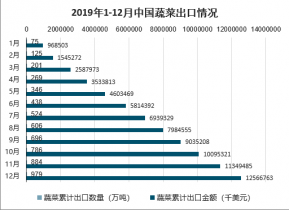 2019年1-12月中國蔬菜出口數量為979萬噸,同比增長3.3%;2019年1-12月中國蔬菜出口金額為12566763千美元,同比下降0.4%。