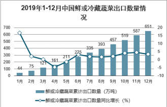 2019年1-12月中國鮮或冷藏蔬菜出口數量為651萬噸,同比增長3.5。