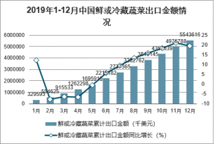 2019年1-12月中國鮮或冷藏蔬菜出口金額為5543616千美元,同比增長19.5%。