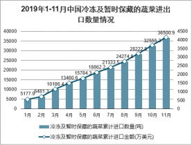 2019年1-11月冷凍及暫時(shí)保藏的蔬菜進(jìn)口數(shù)量為36500.9噸,同比增長(zhǎng)16.2%;出口數(shù)量為1157644.5噸,同比增長(zhǎng)5.0%。