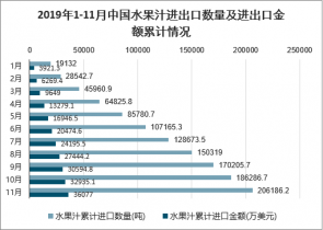 2019年1-11月水果汁進(jìn)口數(shù)量為206186.2噸,同比增長20.3%;出口數(shù)量為347114.2噸,同比下降41.8%。