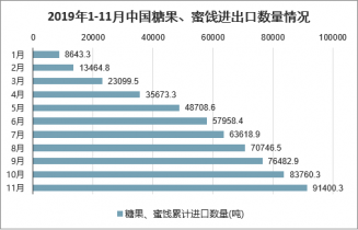 2019年1-11月糖果、蜜餞進(jìn)口數(shù)量為91400.3噸,同比增長49.8%;出口數(shù)量為376592.5噸,同比增長2.8%。2019年1-11月糖果、蜜餞進(jìn)口金額為30080萬美元,同比增長26.7%;出口金額為115480萬美元,同比增長6%。