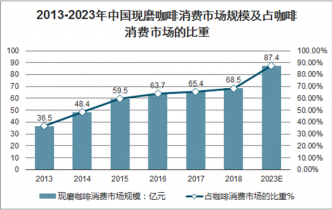 2013-2023年中國現(xiàn)磨咖啡消費市場規(guī)模及占咖啡消費市場的比重