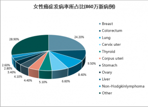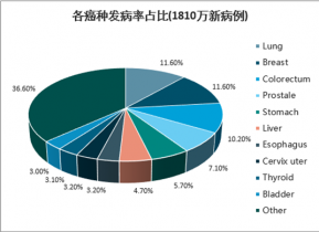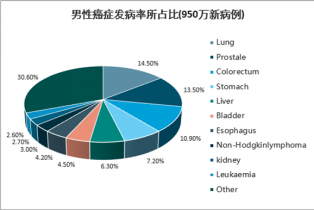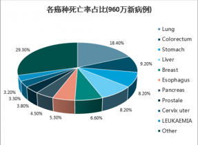 發病率其次為女性乳腺癌(11.6%)、前列腺癌(7.1%)、結直腸癌(6.1%);死亡比例其次為結直腸癌(9.2%)、胃癌(8.2%)、肝癌(8.2%)。