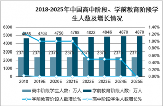 2018-2025年中國高中階段、學前教育階段學生人數及增長情況