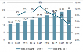 2011-2019年全國發(fā)電機(jī)容量增長趨勢及預(yù)測(單位:億KW,%)