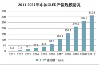 自2011年以來,中國OLED產值規模呈現逐年增加的趨勢,預計2019年中國OLED產值規模達到216.2億美元,2020年將達266.3億美元,2021年將突破300億美元,達到312.4億美元。