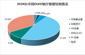 從2019Q1中國OLED細分領域結構來看,手機OLED和電視占比較大,分別占比47.2%和33.9%,其次PC設備占比9.4%。車載顯示占比最少,僅1.9%。