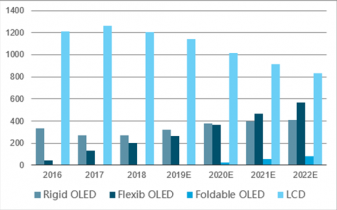 圖表5:2015-2019年柔性O(shè)LED面板行業(yè)重要數(shù)據(jù)指標(biāo)比較