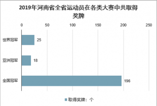 2019年河南省全省運動員在各類大賽中共取得239枚金牌,世界冠軍25個,亞洲冠軍18個,全國冠軍196個。