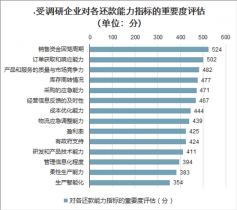 為了評估客戶的還款能力,受調研企業會考慮一系列的指標,這些指標涵蓋了企業的供應鏈管理、營銷、生產、產品、企業管理、與資方的信息共享程度、政府資源等各個方面的能力。根據受調研企業對這些指標的重要度評分及總分排序,銷售資金回籠周期、訂單獲取和響應能力是最重要的兩個指標,而研發、管理信息化、柔性生產、生產智能化等其他能力并不直接帶來還款能力,因此排名相對靠后。但不管排名如何,所有的指標都是受調研企業重視的指標,因為選擇“不考慮”和“不重要”選項的企業非常少。換言之,在VUCA時代,融資企業只有擁有了上述各方面的能力,尤其是在資金回籠、銷售、供應鏈管理方面的能力,才能獲得金融機構的青睞。