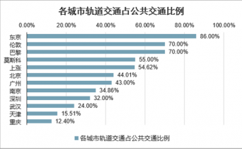 我國軌道交通占公共交通比例低于要國際城市。城軌出行是國際絕大部分都市最主要的公共交通方式,東京軌道交通占公共交通客運(yùn)量達(dá)到86%,巴黎和倫敦達(dá)到了70%,我國的主要城市上海、北京軌交占公共交通出行比例目前僅為54.6%和44.0%,距離國際主要城市仍有較大提高空間。