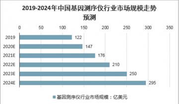 基因測序的應用領域迅速拓寬,基因測序市場規(guī)模快速增長,據(jù)預測,2020年我國基因測序行業(yè)市場規(guī)模將達到147億美元。到2024年,市場規(guī)模將近300億美元。