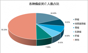 肺癌、乳腺癌和結腸直腸癌是罹患人數最多的癌癥。肺癌死亡人數最多,預計2018年將造成180萬人死亡,占預計癌癥死亡總人數的18.4%;結腸直腸癌造成的死亡人數排第二,將導致88.1萬人死亡;乳腺癌排名第五,將導致62.7萬人死亡。肺癌、結腸直腸癌和乳腺癌這3種癌癥加在一起,占2018年全球預計癌癥死亡人數的1/3。此外,胃癌和肝癌分別會導致78.3萬人、78.2萬人死亡,排名第三和第四。