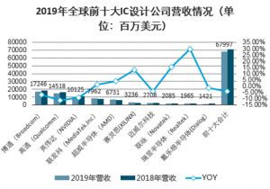 2019年全球前十大IC設計公司營收情況(單位:百萬美元)