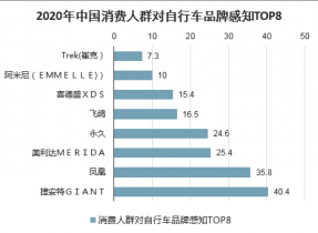 2020年消費人群對自行車品牌感知度TOP8分別為捷安特、鳳凰、美利達、永久、飛鴿、喜德盛、阿米尼以及崔克,其中捷安特品牌感知度最高,為40.4%。其次鳳凰品牌感知度也較高,為35.8%。此外美利達品牌感知度為25.4%;永久品牌感知度為24.6%;飛鴿品牌感知度為16.5%;喜德盛品牌感知度為15.4%;阿米尼品牌感知度為10%;崔克品牌感知度為7.3%。