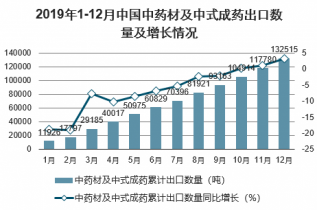 2019年1-12月中國中藥材及中式成藥出口數量為132515噸,同比增長3.2%;2019年1-12月中國中藥材及中式成藥出口金額為1176961千美元,同比增長6.8%。