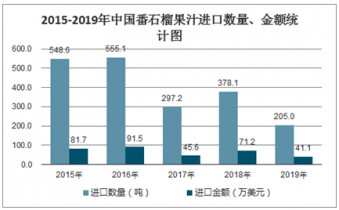 2015-2019年中國番石榴果汁進(jìn)口數(shù)量、金額統(tǒng)計(jì)圖