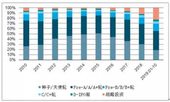 2010-2019年10月,早期(包含種子/天使/Pre-A/A/A+輪)投資占比從2010年的75%降至2019年(1-10月)的55%。這也意味著整體投資由早期向中后期轉移。戰略投資占比明顯增加,2013年為最低點1%,2019年增長至23%。