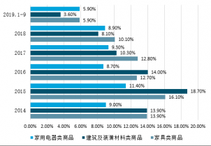 2019年前三季度,家具類商品零售額為1396億元,同比增長5.9%;建筑及裝潢材料類商品零售額為1449億元,同比增長3.6%;家用電器類商品實現零售額6517億元,同比增長5.9%。