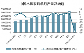 2020年1-2月中國木質家具產量為27987892件,同比下降32.5%。