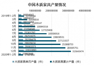 2020年2月中國木質家具產量為13993946件,同比下降32.5%;2020年1-2月中國木質家具產量為27987892件,同比下降32.5%。