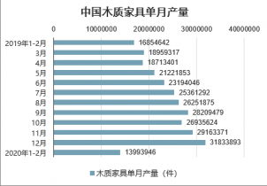 2020年2月中國木質家具產量為13993946件,同比下降32.5%;2020年1-2月中國木質家具產量為27987892件,同比下降32.5%。