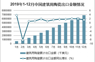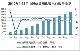 2019年1-12月中國建筑用陶瓷出口數(shù)量為1613萬噸,同比下降9.3%;