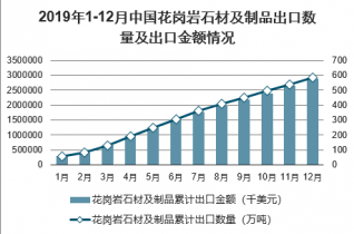 2019年1-12月中國花崗巖石材及制品出口數量為582萬噸,同比下降12.8%;2019年1-12月中國花崗巖石材及制品出口金額為2878669千美元,同比下降11%。