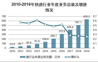 郵政快遞業作為國家戰略性基礎設施和社會組織系統,與產業上下游、外部社會、經濟環境、技術發展程度等關系日漸密切。隨著電商行業的蓬勃發展,快遞行業近幾年也保持著增長的態勢。2010-2019年,我國快遞行業業務總量保持逐年增長的趨勢。2019年,我國快遞業業務量累計完成635.2億件,同比增長25.3%,增速較往年有所放緩。