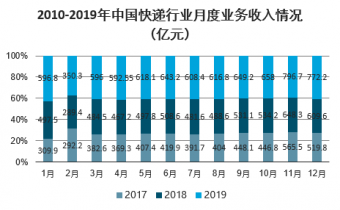 2010-2019年中國快遞行業月度業務收入情況(億元)