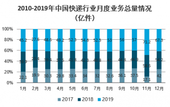 月度情況來看,2017-2019年每年中我國快遞行業當月業務總量和收入走勢基本一致,但每年的2月份和11月份會出現明顯的波動,其原因是2月份為春節快遞需求減少,11月份為購物節所以需求增大。
