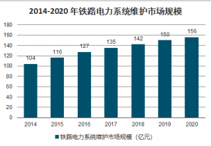 鐵路運(yùn)維檢測(cè)需求的不斷增長(zhǎng),為鐵路電力系統(tǒng)維護(hù)市場(chǎng)提供了發(fā)展空間。預(yù)計(jì)到2020年增長(zhǎng)至156億元,其中接觸網(wǎng)維護(hù)費(fèi)用128.6億元,牽引變電所維護(hù)費(fèi)用27.56億元。