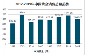 2019年受經濟下行壓力增大等因素的影響,2019年中國黃金消費整體疲軟。2019年中國黃金消費量為1002.78噸,同比下降12.9%。