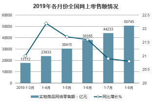 2019年各月份全國(guó)實(shí)物商品網(wǎng)上零售額情況