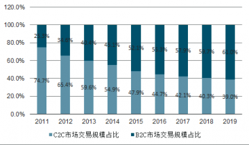 2011-2019年中國(guó)B2C與C2C市場(chǎng)份額對(duì)比