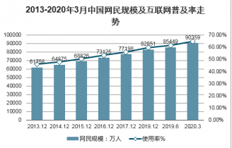 2013-2020年3月中國網(wǎng)民規(guī)模及互聯(lián)網(wǎng)普及率走勢