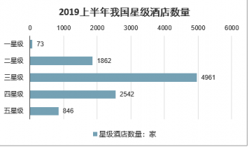 2019年上半年,我國星級酒店總數量為1.02萬家,其中,三星級酒店數量最高,達4961家,占比達48.24%,其次是二星級和四星級酒店,數量分別為1862家、2542家,占比分別為18.11%、24.72%。