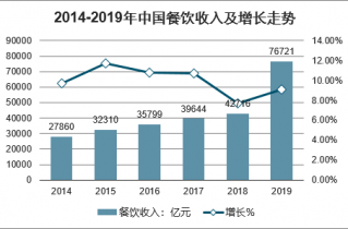 2019年全國餐飲收入46721億元,比上年增長9.4%,高于2018年的7.7%;12月份餐飲收入4825億元,同比增長9.1%。2019年餐飲收入高于2019年社會消費品零售總額1.4個百分點。