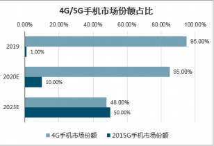從市場結(jié)構(gòu)來看,目前,手機市場仍然以4G手機為主。2019年全球5G智能手機出貨量為1870萬臺,在智能手機市場占比約1.3%。預(yù)測,到2020年,5G手機相繼推出,用戶選擇性更換手機,5G手機市場份額將超10%;4G手機市場占比下滑。2023年,隨著5G手機的商用推廣落地,市場迎來換機潮,5G手機市場份額將超五成;4G手機市場占比進一步下滑。