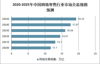 隨著互聯(lián)網(wǎng)技術(shù)的完善和互聯(lián)網(wǎng)終端的普及加速了“全民互聯(lián)”時代的到來,同時社會主力消費群體正轉(zhuǎn)向 80 后、90 后人群,彰顯時尚個性、高學(xué)歷、貼近互聯(lián)網(wǎng)、追求高品質(zhì)生活成為其主要特點,在此大環(huán)境下中國網(wǎng)絡(luò)零售產(chǎn)業(yè)整體步入快速增長階段。新一代的人群,將是奠定網(wǎng)絡(luò)零售良好的客群用戶基礎(chǔ),并且釋放出巨大的市場潛力。未來,我國網(wǎng)絡(luò)零售交易規(guī)模將會保持持續(xù)增長,按照《電子商務(wù)“十三五”發(fā)展規(guī)劃》,預(yù)計2020年我國網(wǎng)絡(luò)零售交易額將達到11萬億,預(yù)計到2025年我國網(wǎng)絡(luò)零售行業(yè)市場交易規(guī)模將達到19.33億元。