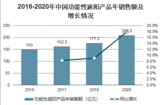 2016-2020年中國功能性遮陽產品年銷售額及增長情況