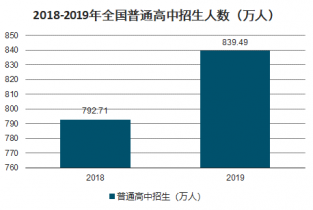 2019年全國普通高中1.40萬所,比上年增加227所,增長1.65%;招生839.49萬人,比上年增加46.79萬人,增長5.90%;在校生2414.31萬人,比上年增加38.93萬人,增長1.64%;畢業生789.25萬人,比上年增加10.01萬人,增長1.28%。