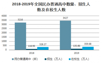 2019年全國民辦普通高中3427所,比上年增加211所,增長6.56%;招生135.86萬人,比上年增加18.91萬人,增長16.17%;在校生359.68萬人,比上年增加31.41萬人,增長9.57%。