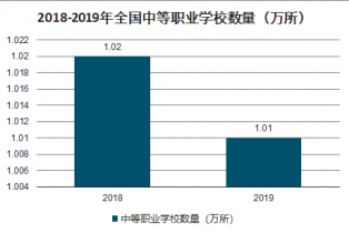 2019年全國(guó)中等職業(yè)學(xué)校1.01萬所,比上年減少151所。其中,普通中等專業(yè)學(xué)校3339所,比上年增加17所;成人中等專業(yè)學(xué)校1032所,比上年減少65所;職業(yè)高中3315所,比上年減少116所;技工學(xué)校2392所,比上年增加13所。