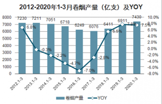 2012-2020年1-3月卷煙產(chǎn)量(億支)及YOY