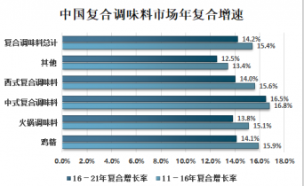從中國復合調味料細分市場來看,中式復合調味料年復合增速領先,2016年,雞精、火鍋調味料、中式復合調味料、西式復合調味料的市場規模分別為243億元、174億元、141億元、165億元,2011年-2016年復合增長率分別為15.9%、15.1%、16.8%和15.6%。預計至2021年雞精、火鍋調味料、中式復合調味料、西式復合調味料的市場規模將分別增長至236億元、318億元、302億元、332億元,2016年-2021年復合增長率分別為14.1%、13.8%、16.5%、14%。
